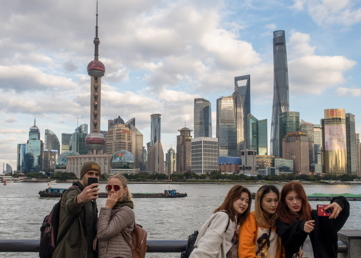Tourists pose for photographs on the Bund, a major scenic spot on the Huangpu River, in Shanghai. [Photo by Wang Gang/For China Daily]