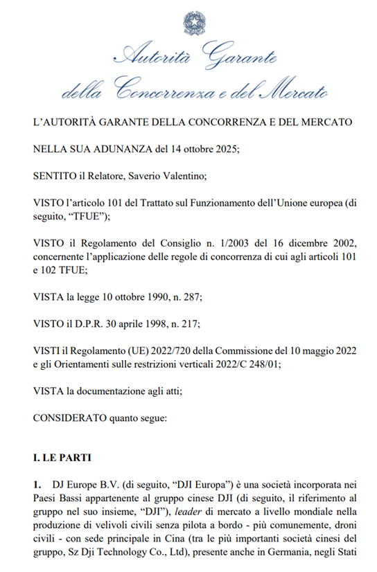 2025年10月29日,意大利竞争与市场管理局(AGCM)正式宣布,对中国无人机制造商深圳市大疆创新科技有限公司(DJI)欧洲子公司DJI Europe B.V.及其意大利分销商Nital S.p.A.启动反垄断调查,案件编号为I878。本次调查的焦点在于,大疆是否通过其独家分销渠道对意大利市场的无人机销售实施了“转售价格维持”(Resale Price Maintenance, RPM)行为,即通过监控和干预零售价格的方式,限制经销商自由定价,从而扭曲市场竞争。