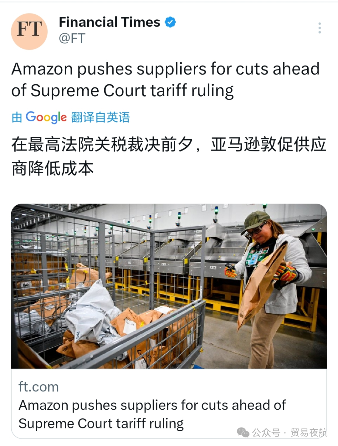 报道称,亚马逊此举旨在美国最高法院就关税合法性作出裁决前加快谈判进程。