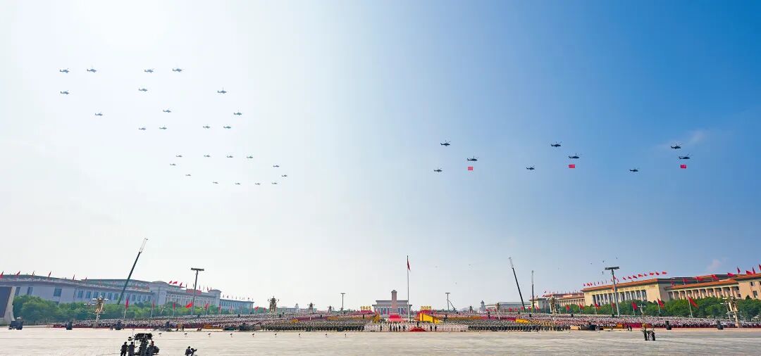 2025年9月3日,纪念中国人民抗日战争暨世界反法西斯战争胜利80周年大会在北京隆重举行。这是空中护旗梯队飞过天安门广场上空。 新华社记者 邢广利/摄