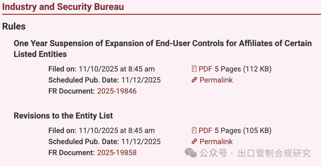 当地时间11月10日,美国商务部工业与安全局(BIS)发布了一项最终规则,核心内容是决定将其在2025年9月30日发布的“扩大最终用户管制以涵盖某些所列实体的关联方实体”(Affiliates Rule)规则(简称“关联方规则”或者“50%”规则)暂停实施一年。