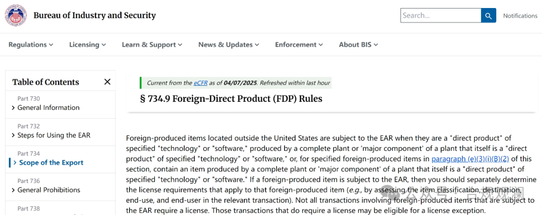 “外国直接产品规则”(Foreign Direct Product Rule,简称“FDPR”)是美国出口管制制度中认定一个物项是否应受美国出口管制法律管辖的重要规则之一。其管控规则是,位于美国境外的外国生产的物项,当它属于特定“技术 (technology)”“软件 (software)”的直接产品,或者生产该物项的工厂 (plant) 或工厂的主要设备 (major component) 属于特定“技术 (technology)”“软件 (software)”的直接产品时,向满足一定的国别范围、最终用途或者最终用户转移时,将受到《出口管制条例》(EAR) 管制。这里工厂的主要设备是指对生产某物品“至关重要的设备”,包括测试设备。同时需要说明的是,受EAR管辖的外国直接产品不必然受许可证要求管制,是否受许可证要求管制必须基于物项归类、目的地、最终用户、最终用途来判定。这一点在2022年2月美国工业与安全局 (BIS) 在对规则进行修改的时候进行了澄清。
