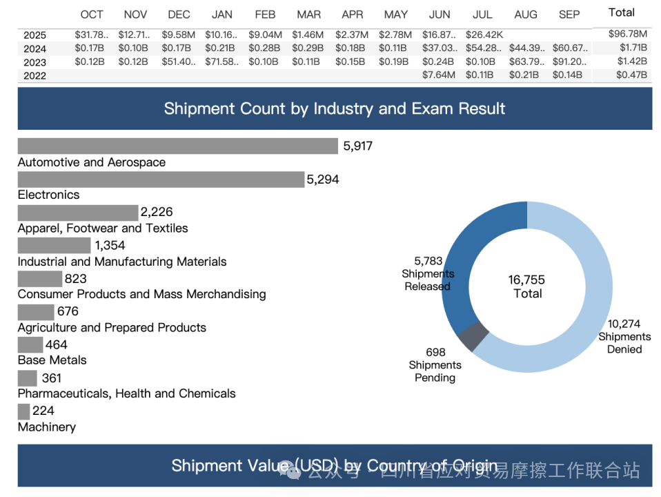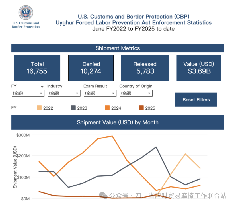 根据该法案,美国海关及边境保护局(CBP)负责实施该法案的可反驳推定。根据该报告及CBP官网数据,自2022年6月以来,截至2025年7月,CBP已检查超过16,700批货物,总货值近37亿美元,其中超过10,000批货物被拒绝入境。