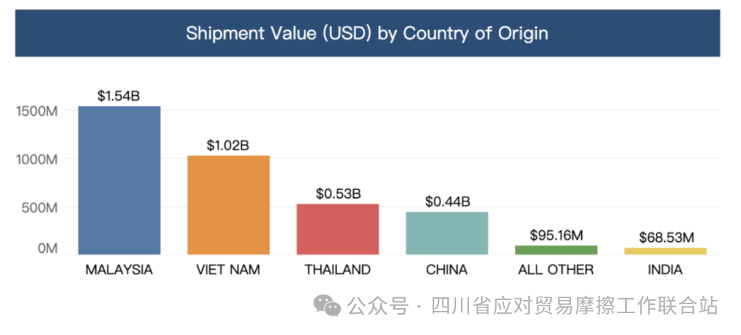根据货物原产国的统计,马来西亚的货物总价值最高,达到15.4亿美元,位居首位。越南紧随其后,为10.2亿美元,占比较大。泰国和中国分别为5.3亿美元和4.4亿美元。整体来看,东南亚国家(马来西亚、越南、泰国)占据货物总价值的主要份额,远高于中国及其他国家。原因是东南亚国家的原材料可能来自新疆地区。