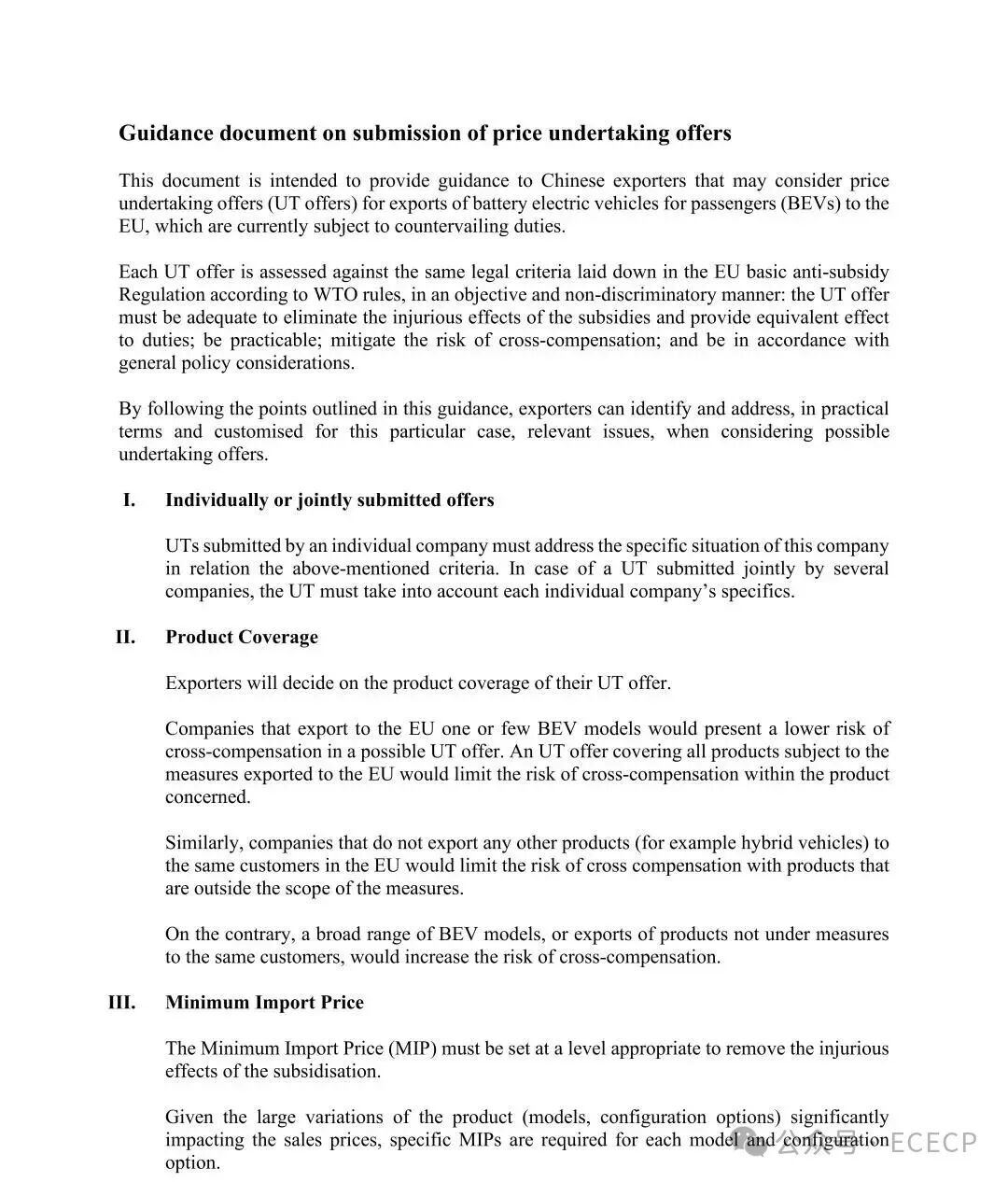 欧盟委员会2026年1月12日正式发布了关于对中国纯电动汽车(BEV)实施反补贴税背景下提交价格承诺申请的指导文件,作为中国出口商对欧提交价格承诺的通用指导框架。文件涵盖了价格承诺中需要重点说明的多项要素,包括最低进口价格、销售渠道、交叉补贴以及未来在欧盟的投资。欧盟委员会将秉持非歧视原则,对每一项价格承诺申请适用相同的法律标准,并以客观和公正的方式进行评估。