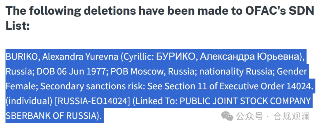 据美国财政部网站12月30日发布的消息,美国解除了对俄罗斯国有银行俄罗斯联邦储蓄银行(Sberbank)前首席财务官亚历山德拉·布里科(Alexandra Buriko)的制裁,将其移出SDN清单。