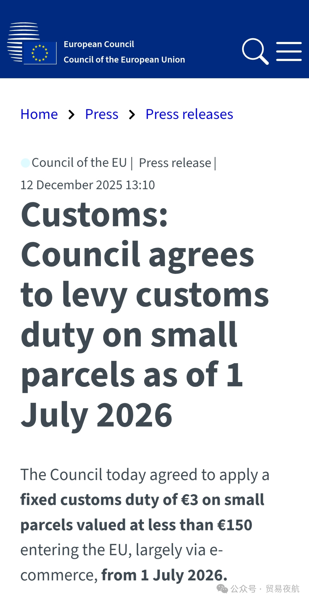 2025年12月12日,欧盟理事会通过决定:从 2026 年 7 月 1 日起,欧盟将对价值低于 150 欧元(约合1242元人民币)的跨境小包裹(主要通过电子商务渠道进入)征收 3 欧元(约合25元人民币)的固定关税。