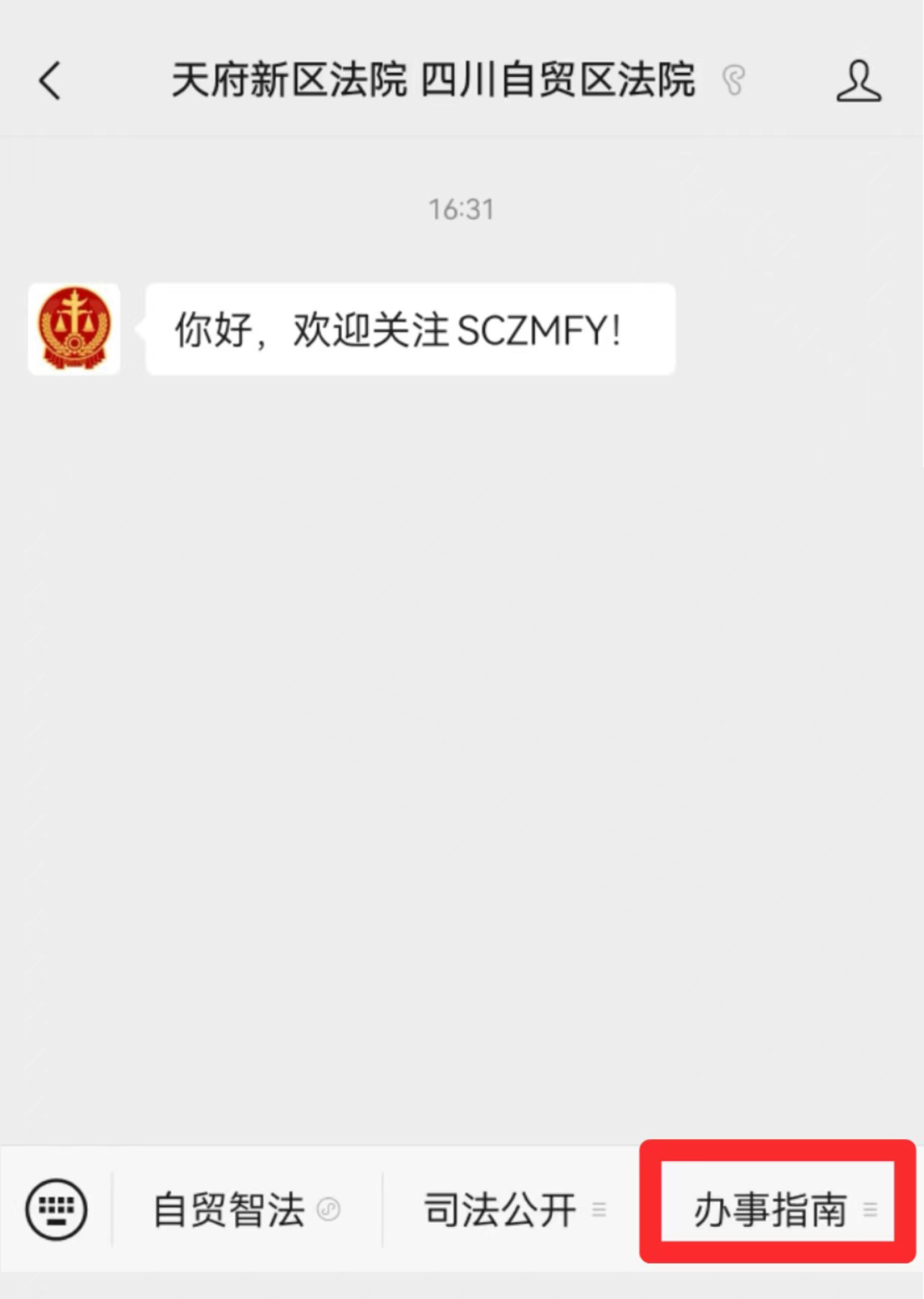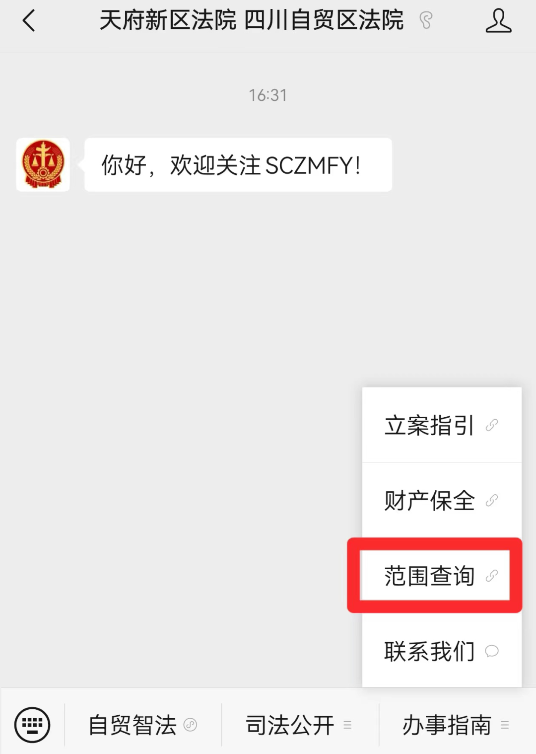 关注“天府新区法院 四川自贸区法院”微信公众号,进入该公众号首页,点击右下角“办事指南”→“范围查询”。