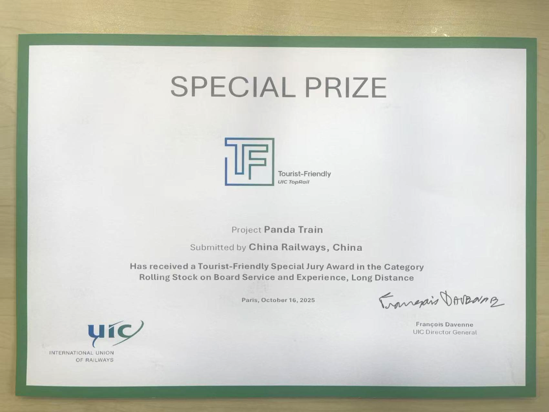 近日,国际铁路联盟(UIC)在法国巴黎举办首届“游客友好型铁路服务与体验奖”颁奖仪式,“熊猫专列”荣获“长途旅游友好型列车及车上服务‘评审团特别奖’”,这也是中国地区唯一入围决赛的项目。