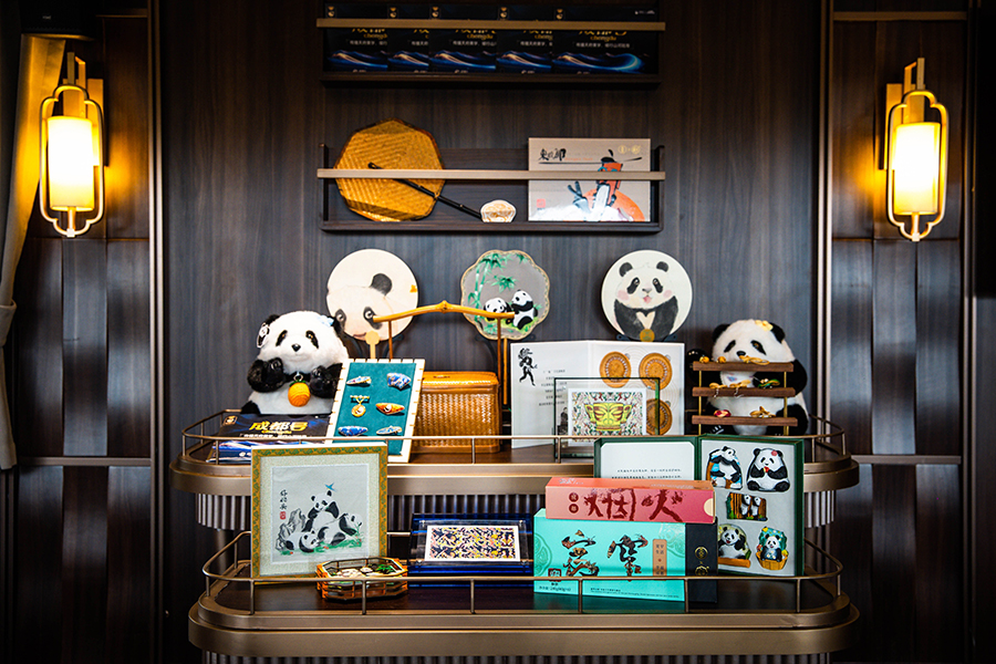 熊猫专列·成都号是由中国铁路成都局集团有限公司与成都文旅集团共同打造的品质型旅游列车,车身为宝石蓝涂装,蜀山轮廓化作金色的线条,勾勒出蜀川千里江山图。车内设计将木芙蓉、银杏、竹子等天府文化传统元素与现代艺术巧妙融合,以“流动的艺术画廊”为载体,陈列有蜀锦、蜀绣、竹编等7大类近60幅国家级非遗臻品,让天府文化从静态展览变为可触可感的旅途记忆。