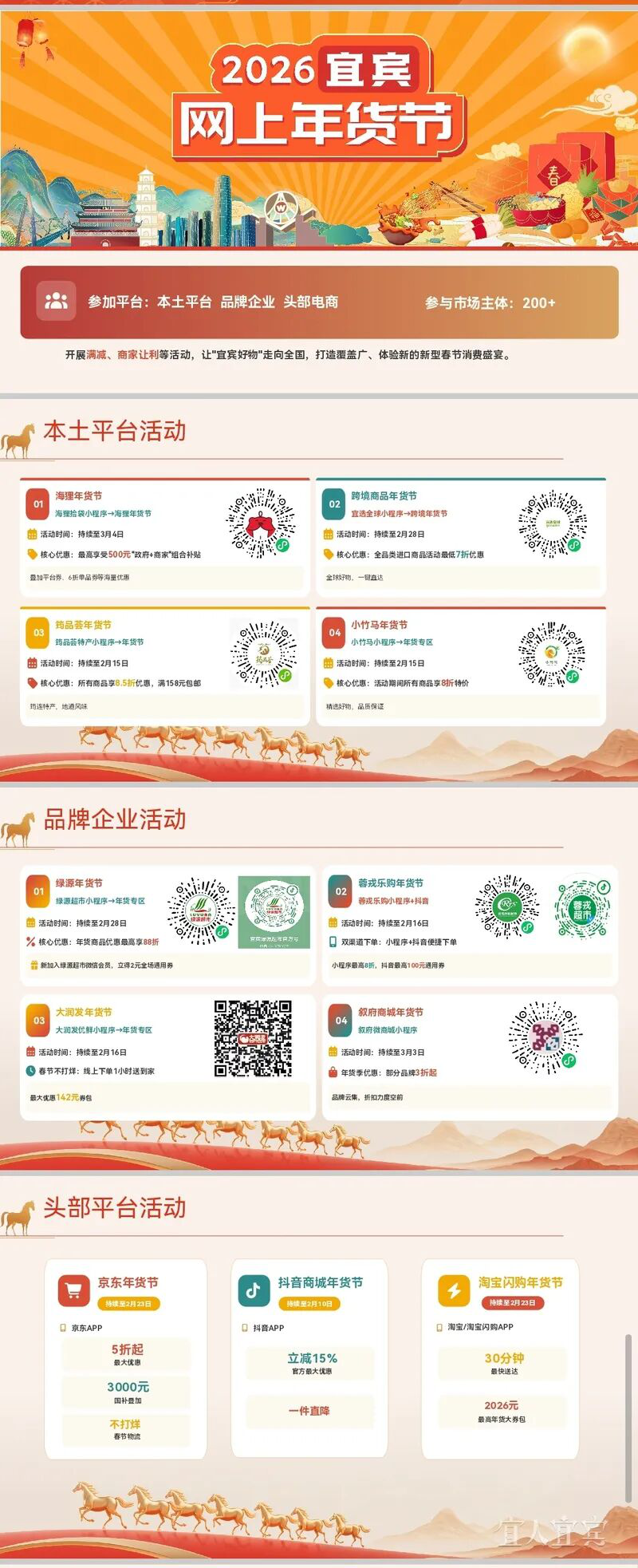 据了解,为深入贯彻落实中、省、市提振消费决策部署,营造新春节庆氛围,激活春节消费市场,市商务局组织各县(区)电商平台、直播基地以及品牌电商企业等200余户企业,围绕“年货、年味”元素,在京东、淘宝、抖音和海狸拾袋、绿源商业、戎蓉乐购等平台统一使用“2026宜宾网上年货节”标识,开展满减、商家让利等活动,让“宜宾好物”走向全国,打造覆盖广、体验新的新型春节消费盛宴,丰富春节期间广大市民的消费供给。