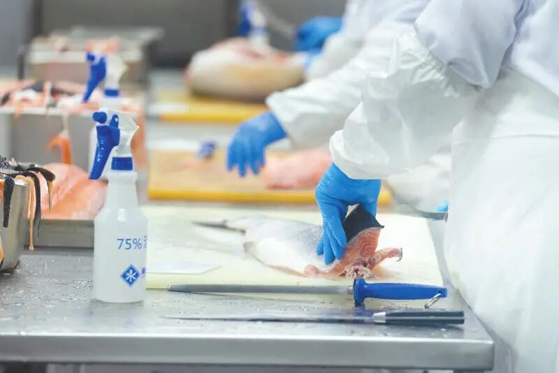 四川美沿远洋食品有限公司内,工人正在对三文鱼进行加工。四川日报全媒体记者 李强 摄