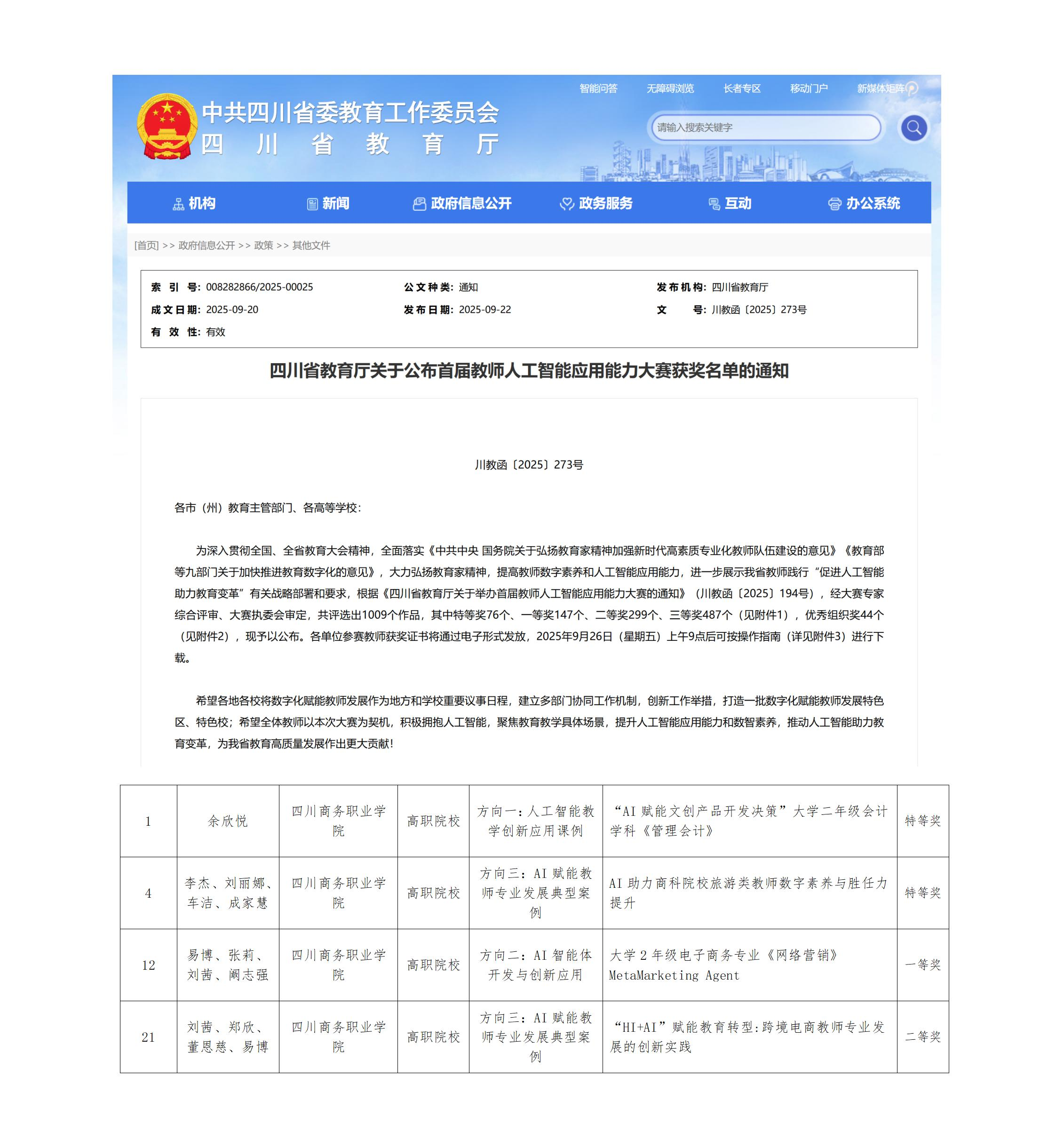 9月22日,由四川省教育厅举办的首届教师人工智能应用能力大赛获奖名单公布,四川商务职业学院教师团队的4个参赛作品全部获奖,其中特等奖2项、一等奖1项、二等奖1项,不仅充分彰显了学院在人工智能教学创新方面的“硬核”实力,还展现了学院教师杰出的数字素养。