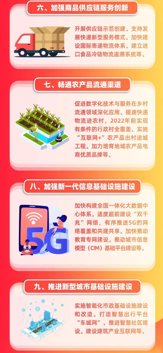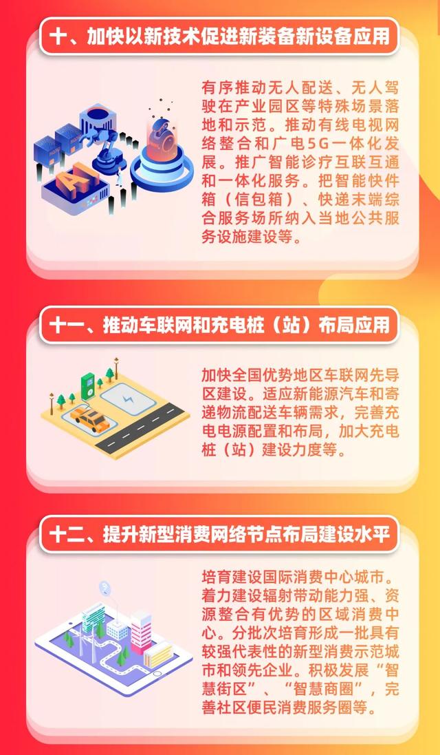 ■二是围绕加快新型消费基础设施和服务保障能力建设,明确加强商品供应链服务创新,畅通农产品流通渠道,加强新一代信息基础设施建设,推进新型城市基础设施建设,加快以新技术促进新装备新设备应用,推动车联网和充电桩(站)布局应用,提升新型消费网络节点布局建设水平。