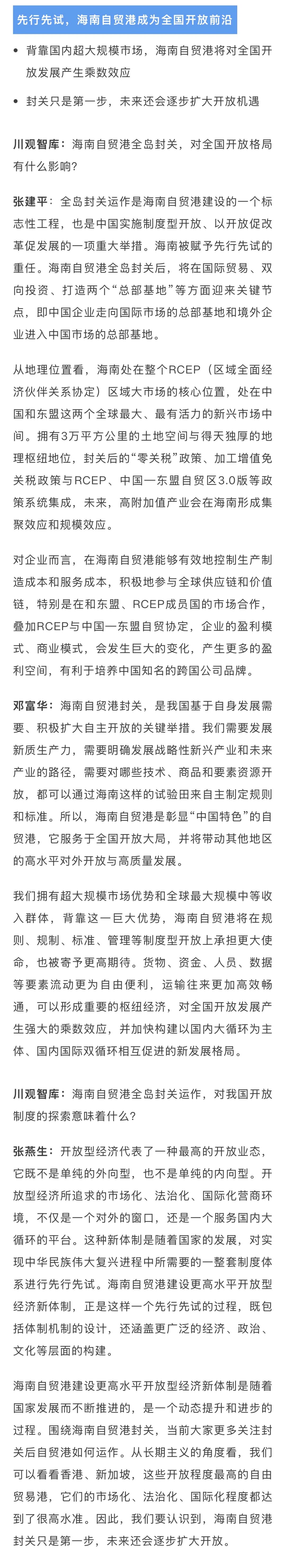 海南自贸港全岛封关,对中国开放格局有什么影响?与海南相隔1800公里的四川,又有何机遇和挑战?为此,川观智库专访了商务部国际贸易经济合作研究院学术委员会副主任张建平,中国宏观经济研究院研究员张燕生,西南财经大学国际商学院院长助理、副教授邓富华。